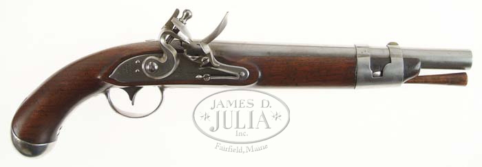 RARE SPRINGFIELD MODEL 1817 FLINTLOCK MARTIAL PISTOL. Cal. 71. NSN. 11-3/16″ rnd bbl. This is one of only two pistols that were ever made at The Springfield Armory. It is the early variant, with gooseneck hammer & teat at back edge of lockplate, which is sometimes referred to as the 1807, even though the gun was not assembled until 1818. One thousand of these guns were assembled primarily from muskets & rifle parts. Most of these were converted to percussion, marked “SPRING/FIELD/1818″ vertically at the rear of the lockplate. Also dated 1818 on top of the bbl. “ET” and “S” cartouches on the left side of the stock, “P” in a sunken cartouche over “eaglehead over V” on the upper left part of the bbl. “T” inspector marks on internal lock parts. No marks on the hammer, frizzen, or pan. The bbl shows signs of reconversion. CONDITION: All metal has been restored to Armory bright. Wood has been lightly cleaned. Mechanically fine. 4-57987 (5,000-6,000)