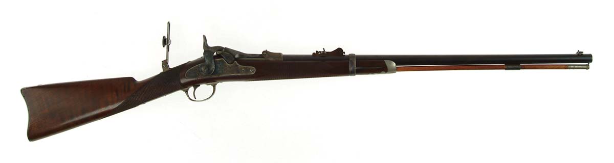 FINE SPRINGFIELD OFFICER’S MODEL RIFLE. NSN. Cal. .45/70. 26” rnd bbl. At first glance, this appears to be a Harrington & Richardson replica, due to the extra engraving on the lockplate, hammer, action & buttplate. However, a closer look reveals that the rear sight has the proper Sharps marking on the staff. The breechblock has the early marking with “MODEL 1873 / eagle head / crossed arrows / US.” The inside of the lockplate is marked with “U” and “F” inspector marks. The lock cavity and tang sight cavity show great age. The pewter forearm tip is 3” long and rounded over at the front. The length of the forearm ahead of the bbl band is 3-1/4” as opposed to the 3-3/4” normally found on later guns. The checkering has dbl border. The rear sight is marked with an “R” on both the base & the staff and has the standard graduations up to twelve. The ramrod has the fastening hole in the plated brass tip and has the correct loop at the base. The lockplate screws and escutcheons are also engraved. The Beech front sight is blue instead of the gold normally found on these. CONDITION: Excellent. Bright blue on the bbl and case hardening colors on the breechblock, lockplate, hammer & buttplate. Single set trigger has a smooth front face. Stock has a number of rack scratches above the trigger but otherwise is excellent. Mechanically excellent. Some of the features on this are unusual, but it appears to be an orig gun. From the collection of the late Bruce McDowell. 4-54639 FS73 (30,000-40,000)