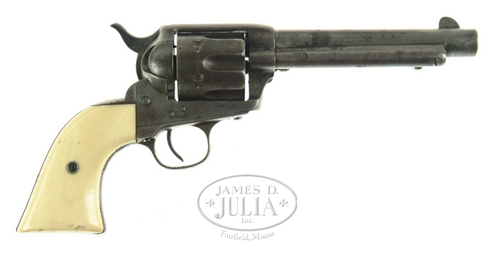 COLT SGL ACTION ARMY REVOLVER. Cal. 41 Colt. SN 140006. Usual configuration with 5-1/2″ bbl, fixed sights, 2-line patent markings with rampant Colt in a broken circle. It has smooth 2-pc ivory grips. It is accompanied by a Colt Factory letter identifying this revolver with a silver finish and ivory grips as having been shipped May 27, 1891 to William Challen, Jr, address not indicated. Inside the grips in the left side is scratched the name “JACK LAND” and inside the right grip is scratched either the “77” or “17” “RANCH” with the name “BUCK CAMP” and “WYO”. Preliminary Google search disclosed that there is actually a 77 Ranch in Wyoming. CONDITION: Good plus. Orig silver finish remains only under the ejector rod housing and in the sight groove with traces in the loading cut-out. Balance of the revolver is a mottled silver/brown patina with a spot of heavy rust on the bbl about 1″ in front of the frame. Frame & back strap have scattered fine pitting, as does the cylinder. Cylinder pin screw & front trigger guard screw are replacements. Safety notch is missing and it will not hold at half cock, otherwise mechanics are fine, strong bore with light to moderate pitting. Grips are extremely fine with a few age lines in the bottom and both sides retain a wonderful smooth mellow gold patina. A rare Colt that has seen some hard use. 4-57436 (3,000-5,000)