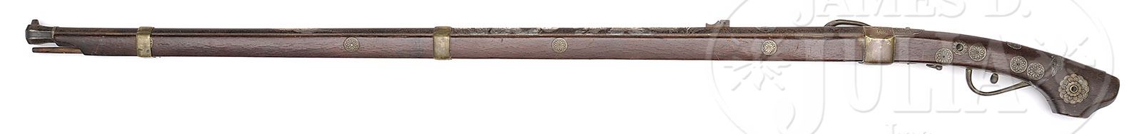MATCHLOCK MUSKET. 19th century, Japan. Iron barrel inlaid with auspicious emblems in silver. Brass mounts engraved with foo dogs and peonies. Approx. 45 cal. SIZE: 53-1/2″ l. CONDITION: Generally good with loss to inlay. 7-70292 (600-800)