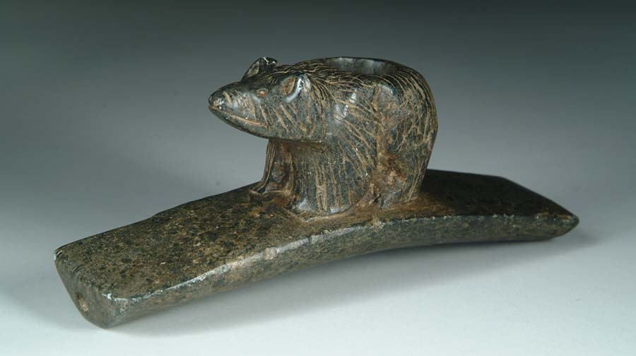 HOPEWELL TYPE MONITOR PIPE WITH BEAR EFFIGY. Black steatite. Age unknown. SIZE: 9-1/4” l x 3-3/4” h. CONDITION: Very good. 9-25984-36 The Tennessee Collection of Prehistoric Indian Artifacts from the Allen Graves Estate. SPECIAL NOTE: We do not regularly sell Prehistoric Indian stone artifacts and therefore have very little experience and no expertise in this area. All of the following lots have come from the Collection of the Late Allen Graves of Tennessee. The collection was inherited some years back by his daughter, who now lives in Maine. This collection was consigned to us directly from her. We employed someone to generally identify styles and types, but as stated above, due to our lack of expertise in this field, we can not guarantee the age or origin of the following pieces. We are relying on you, the buyer, to determine to your satisfaction the origin and age of each item in the collection. (750-2,500)