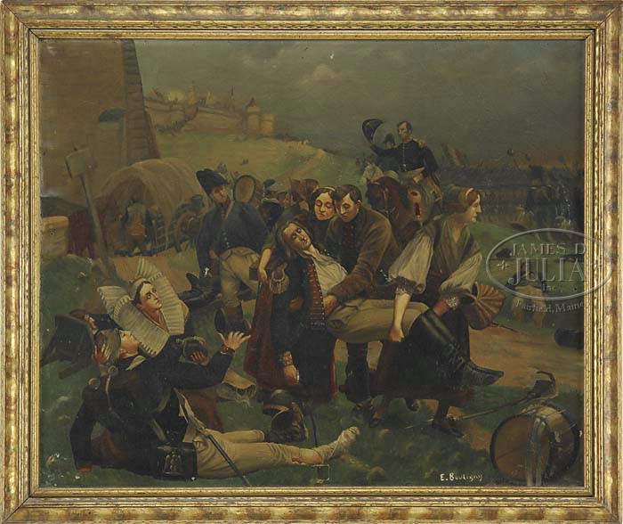 PAUL EMILE BOUTIGNY (French 1854-1929) DEATH OF A GENERAL. Large oil on canvas depicting a dead or dying General. Aftermath of battle scene in background. Signed lower right “E. Boutigny”. Housed in a early 20th Century gilt molded frame. SIZE: 28-1/2” w x 23” h. CONDITION: Soiled and with a couple of small scattered imperfections. Overall craquelure. 8-85512 (1,750-2,750)