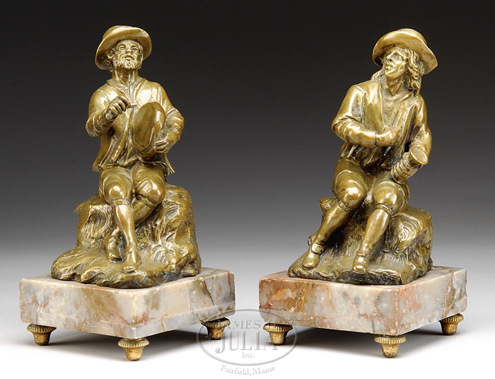 UNSIGNED (French, 19th Century) PAIR OF 17TH CENTURY STYLE FIGURES OF MEN. Bronze figures set atop matching gray and red marble square plinths having turnip type brass feet. Each man sits on a naturalistic ground, one holding a cup with arm curled toward chest which may have held something at one time. The other holds a round drum on his lap and his hand holds what probably was some sort of stick which is not present. Unsigned but with a very nice aged patina. SIZE: Bronze is 7″ h. 9-1/2″ with base. CONDITION: As noted above, otherwise very good. 9-90691 (800-1,200)