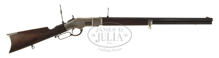 SPECTACULAR ENGRAVED WINCHESTER MODEL 1866 LEVER ACTION RIFLE. Cal. 44 RF Henry. SN 38056. Fabulous ’66 rifle with 24-1/4″ oct bbl, full magazine, German silver Rocky Mountain front sight with 900-yard Henry ladder rear sight & an early style tang sight with 3-1/2″ staff. It is mounted with very highly figured 3X center crotch cut flame grain walnut, uncheckered, with straight stock & crescent buttplate with trap containing a 4-pc brass & iron wiping rod. Receiver, forend cap & buttplate tang are spectacularly engraved by John Ulrich with the left side if the receiver having a very large oval vignette of a dog chasing a leaping stag in a field scene with hills & trees in the background. Surrounded by full coverage spectacular intertwined foliate & floral arabesque patterns with a very fine punch dot background. Front flats have similar but somewhat different Moorish engraved patterns with lots of open space & a fine punch dot background. Right side of the receiver has a very large unused Moorish style presentation panel surrounded by foliate arabesque patterns. Top of the receiver has a foliate spray just forward of the ejection port & a Moorish pattern with punch dot background behind. Border around the two sides is typical Ulrich. Forend cap has his trademark medallions & flower blossoms on each side. Buttplate tang has a deep incised foliate & geometric pattern. This rifle originally had gold wash over silver plate with most of the gold wash now missing. Large vignette & portions of the left side have strong gold remaining with strong gold on the front sling swivel. There are traces of gold around the lever pivot & beside the trigger & underneath the wood on the tangs. Left side of the top tang under the wood is engraved “J.U.” and has 3 “X’s” and a small “S” on the side of the bottom tang. Last four digits of the serial number are stamped in the top tang channel of the buttstock & appear again inside the toe of the buttplate. Altogether a most spectacular & unusual ’66. CONDITION: Very fine to extremely fine. Bbl retains about 93-95% strong bright orig blue with fine edge wear & some light nicks & scratches with one small chemical spot on the right flat. Magazine tube retains about 85% orig blue turning slightly plum with a chemical spot on the left side. Forend cap, receiver & buttplate retain about all of their wonderful silver plating with the aforementioned strong gold wash on the left sideplate. Trigger & hammer retain about 90% strong case colors. Wood is sound with usual handling & use marks, a long scratch on the right side of the buttstock & a couple of lighter scratches on the forearm and overall retains most of the orig oil finish. Mechanics are fine, bright shiny bore with scattered spots of light pitting. 4-56996 JR708 (60,000-100,000)