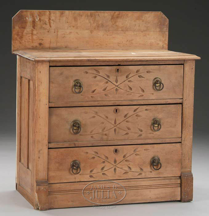 THREE DRAWER VICTORIAN CHEST WITH TALL BACKSPLASH. The antique chest has chip carved drawer fronts and decorative ring pulls. SIZE: 34”h x 31”w x 17”d. CONDITION: Structurally sound, loss to finish, stains. 9-74041 (50-100)