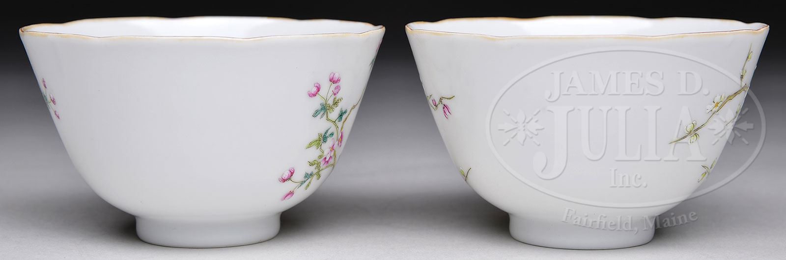 PAIR OF PORCELAIN CUPS. Early 20th century, China. Decoration of flowering plants with bees and flowers. Tung Chih mark on base. SIZE: 2-1/4″ h x 3-7/8″ dia. CONDITION: Very good. 9-29941 (400-600)