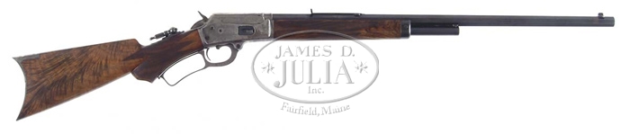 RARE SPECIAL ORDER DELUXE MARLIN MODEL 1889 LEVER ACTION RIFLE. Cal. 44 WCF (44-40). SN 43954. Wonderful little rifle with 24″ oct bbl, ivory bead front sight & semi-buckhorn rear sight that has been filed flat on top, missing the elevator. It has a Lyman tang sight & half magazine. It is mounted with extremely beautiful, about 4X, center crotch cut sunburst American walnut with matching grained forearm, “B” pattern checkered with serpentine pistol grip stock & crescent buttplate. CONDITION: Very fine plus. Bbl & magazine tube retain 92-93% strong orig blue, slightly dull & thin near the receiver. Receiver retains 60-70% orig case colors, bright & strong in the sheltered areas, stronger on the left side. Lever retains about 50% case colors, strong on the left side. Hammer retains about 80% case colors, strong & bright on the left side & rear edge. Wood is sound with very minor nicks & scratches & retains most of its brilliant orig finish. Mechanics are crisp, bright shiny bore with a small spot or two of very light pitting. 4-57125 JR657 (4,000-7,000)