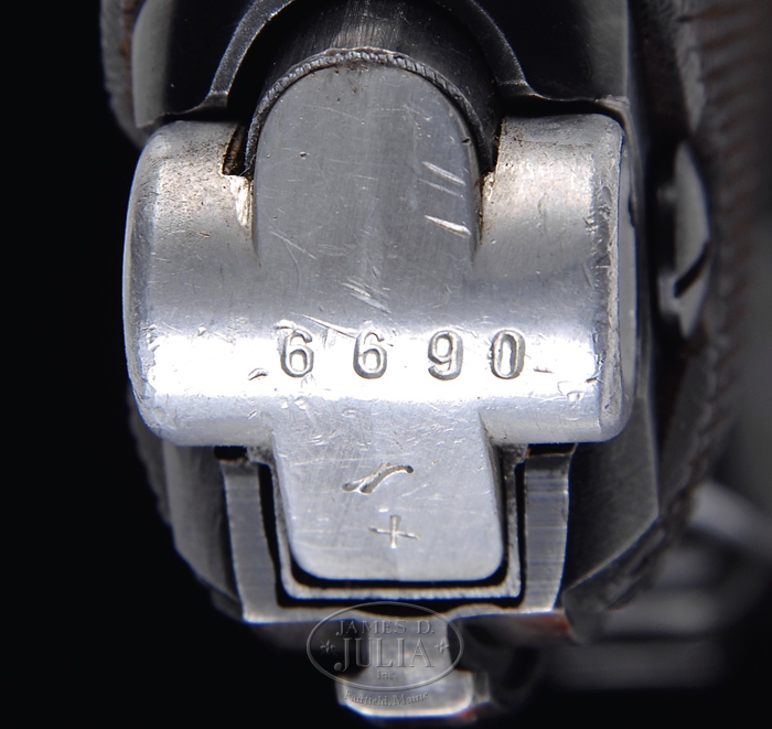 *MAUSER BYF 41 LUGER. SN 6690r. Cal. 9mm. Complete as issued German military luger with the original holster and two orig matching numbered magazines and take-down tool. The checkered walnut grips are excellent and original. Accompanied by a very nice CDG 41 holster is all orig and retains 70% of its black finish. The two matching magazines are totally original. CONDITION: The gun retains at least 95% of the orig blue. Mechanics are fine and the bore is sharp and bright. Holster is complete and in very good condition with unmarked tool. 4-33019 BS3 (3,500-5,000)