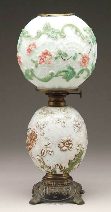 MILK GLASS SPIDER WEB DECORATED GONE WITH THE WIND LAMP. Base with matching shade in white milk glass has a pattern of spider webs and leaf scrolls. Never electrified having original burner. No chimney. SIZE: 18” h. CONDITION: Top of shade has chip, some paint decoration loss. Good. 9-73752 (100-200)