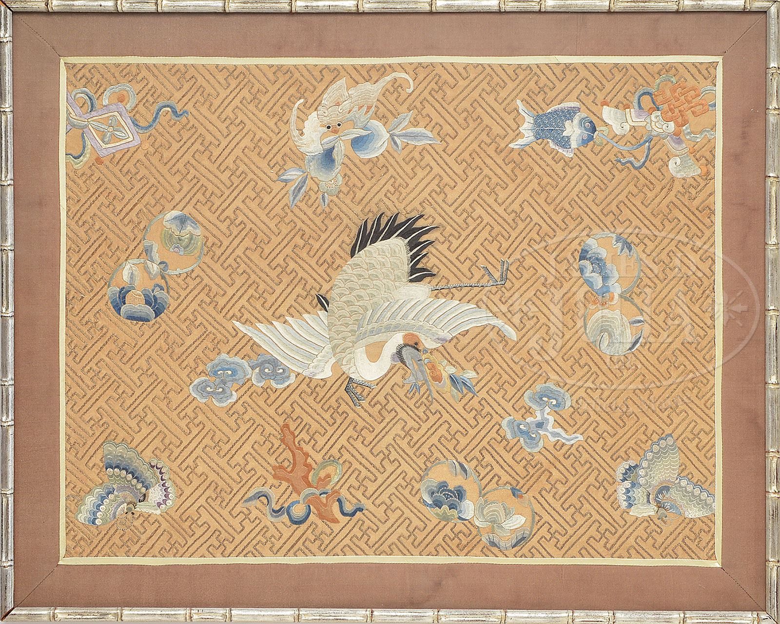EMBROIDERY PANEL. 19th, early 20th century. Pale gold colored silk with a wan character fret in gold embroidered with cranes, butterflies, bats and other auspicious emblems. Framed and glazed. SIZE: 22-3/4″ x 17-1/4″. CONDITION: With even fading overall. Colors remain strong. Slight staining to borders. Otherwise good. 7-73607 (200-300)