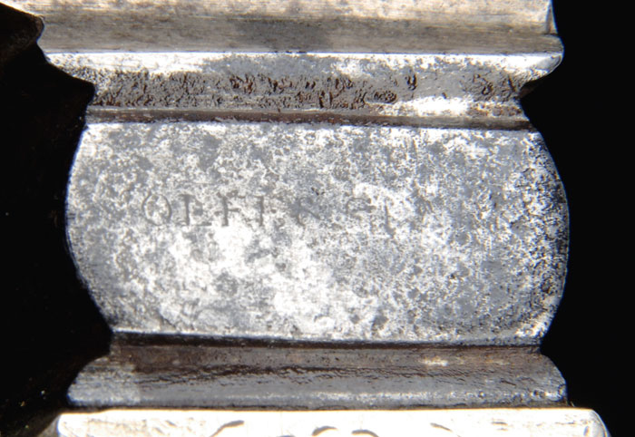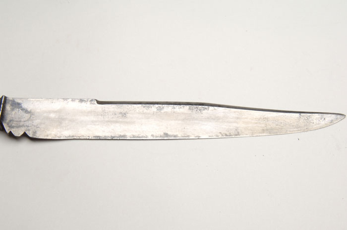 FINE WOLFF & CLARK BOWIE KNIFE WITH HISTORY. 9-1/2” clip point blade with 6-5/8” sharpened false edge on the spine. Marked ‘WOLFF & CLARK” faintly on the left ricasso. The crossguard and hilt is German silver and engraved with a shell pattern on both sides. The stag scales are attached with eight German silver rivets. The leather scabbard is decorated with geometric symbols and has German silver throat and tip. This knife has a history. Included are a letter to a former owner and a book mentioned in the letter. The knife was found in a house in East Greenwich RI owned by a Mrs. Washburn. The Washburns are an old RI family. A book An 1862 Trip to the Wes , written by Lyman Goff was found with the knife which is mentioned in the book. Goff’s granddaughter published this memorial book after his death. CONDITION: Shows signs of cleaning, but light spots of pitting remain. Hilt is fine with pleasant patina. No cracks on the scales. Scabbard has been glued at the tip and has minor cracks on the reverse. Throat is loose. 4-58188 (25,000-35,000)
