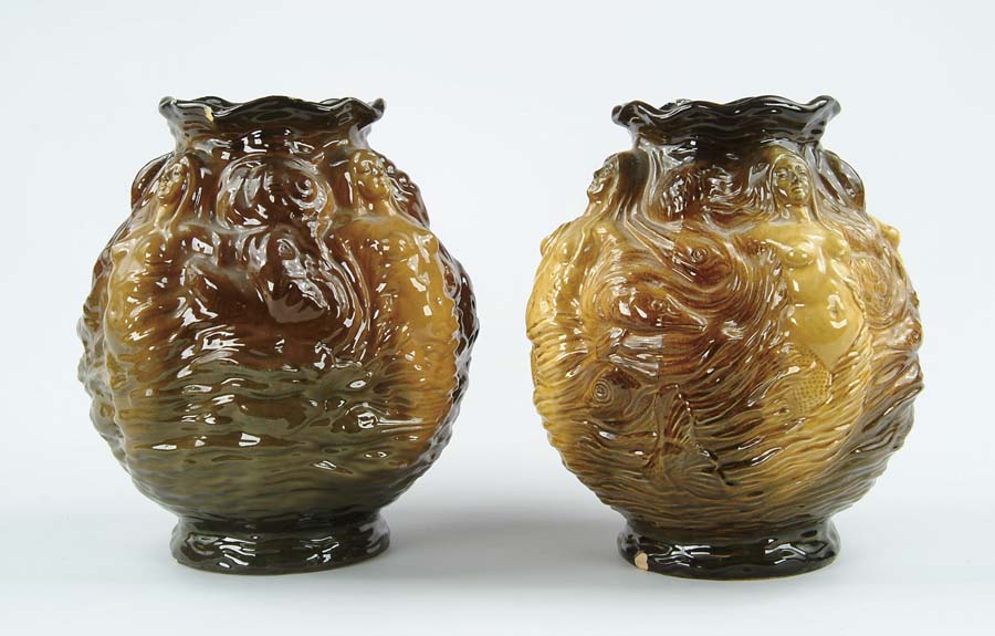 PAIR OF LARGE MERMAID VASES BY VANCE FAIENCE COMPANY. Molded pottery vase has four vertical mermaids standing amongst fish in a gold and brown glaze. Ruffled top and impressed mark to base “Vance F. Co. No. 118 L”. SIZE: 12” h x 20” at widest. CONDITION: Both have chips to rims and glaze chipping. One break has been repaired. Body of each is very good, bases have chips. 9-97334 (700-1,000)