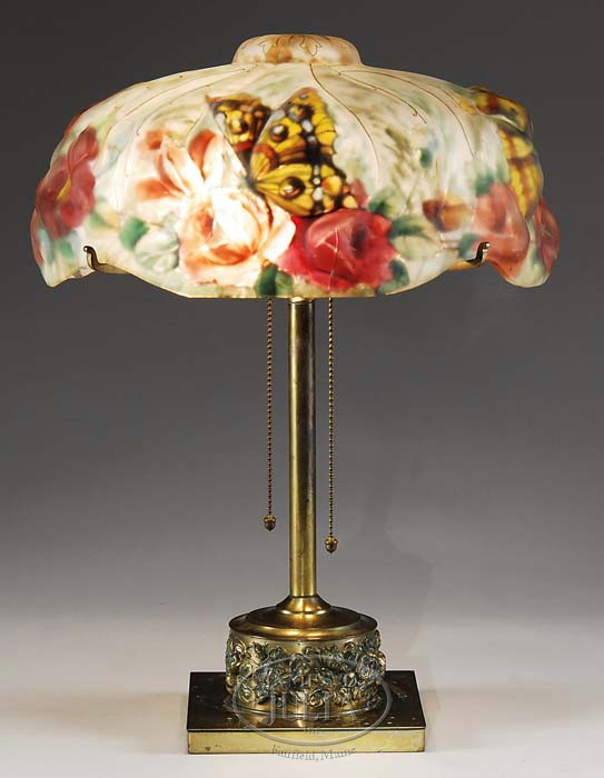 There is a 2″ crack along the side of shade. PAIRPOINT PUFFY TABLE LAMP. Beautiful Pairpoint Papillon shade is decorated with rich red flowers and green leaves with multicolored monarch butterflies hovering above. The puffy decoration is set against a mottled green and white background. Shade is finished with gold gilt outlines on exterior. Shade rests on original Pairpoint base with square foot and cylindrical stem support with raised flower design. The plain slender stem supports a two socket cluster and four arm spider. Shade is unsigned, but marked “Patented” in gold on the exterior. Base is signed “Pairpoint Mfg. Co.” with the Pairpoint logo and also has original “Lacquered” tag. SIZE: Shade is 14″ dia. Overall 20″ t. CONDITION: Very good to excellent. 5-67690 (5,000-7,000)