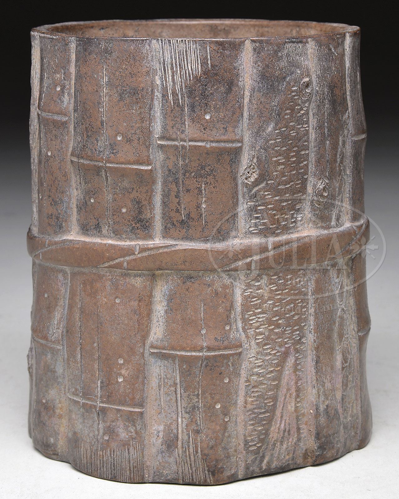 STONEWARE BRUSH POT. 20th Century, China. Yi Hsing ware example of dark chocolate color rendered as a tied bundle of bamboo & pine. Impressed with 4-character mark within a border of calligraphy on base. SIZE: 4-3/4″ h x 4″ dia. CONDITION: Very good with original surfaces. 7-73574 (200-300)