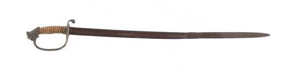 MODEL 1850 OFFICER’S SWORD. 28” blade marked “C. Roby & Co. W.Chelmsford, Mass”. Blade is etched with patroitic motifs, tag with sword reads “Foot Officer’s sword, C. Roby & Co., Mass. Made prior to 1863, during Civil War Blade broke on battle field—picked up by confederate soldier and fixed by local blacksmith—used by the Confederate Army—Found in a barn in Tenn.” CONDITION: Grip wrap is missing as is wire with exception of fragment of sharkskin and one strand twisted wire protected by pommel cap. Grip otherwise is bare carved wood. Last approximate 12” of blade are replaced by a rather crude blacksmith weld. Hilt, pommel and blade show a rustic “barn” type patina. 4-50144 (500-700)