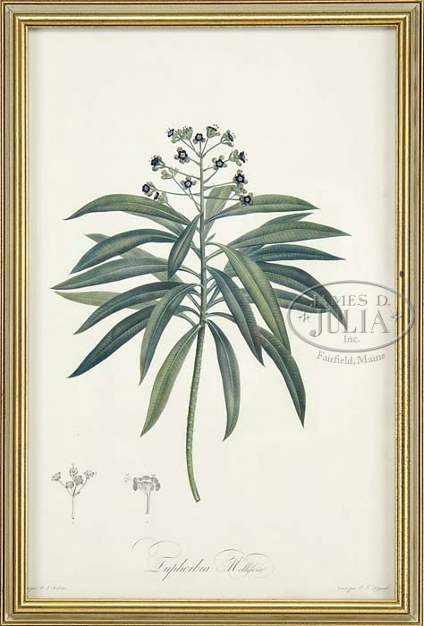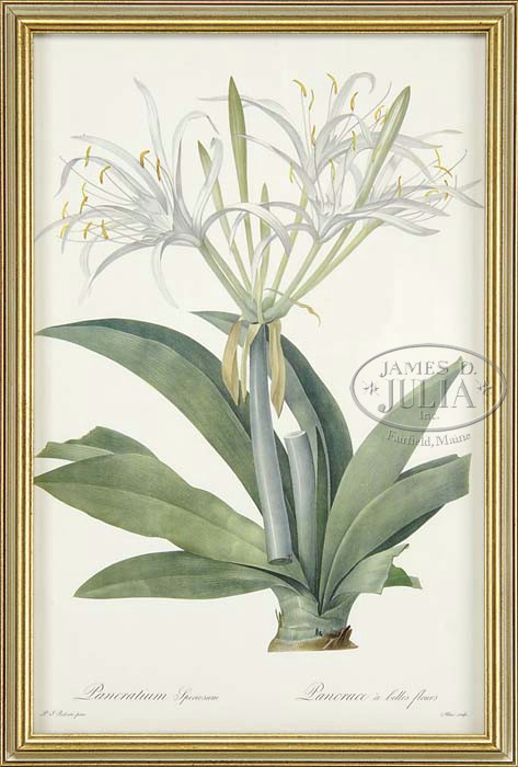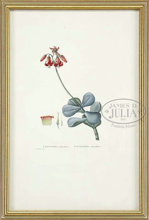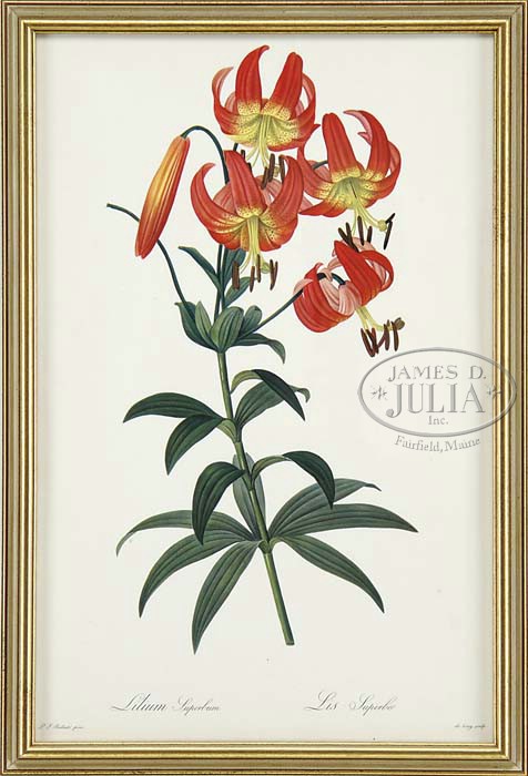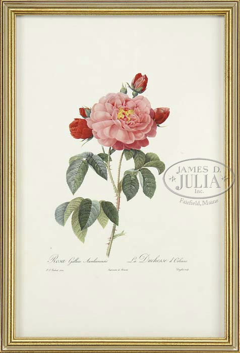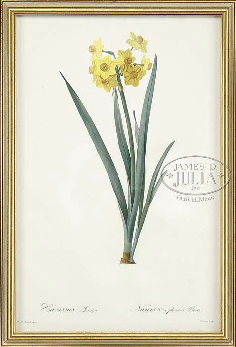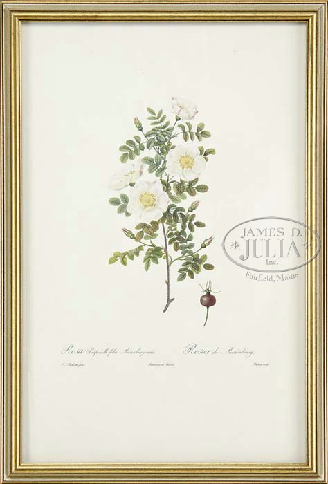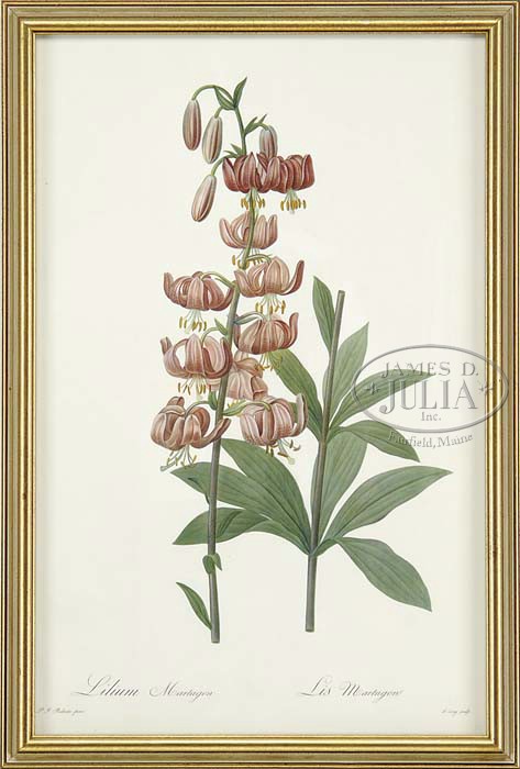 AFTER PIERRE JOSEPH REDOUTE (FRENCH, 1759-1840) 23 COLORED BOTANICAL PRINTS. All identically housed in partial gilt molded wood frames. Various engravers including seven marked “De Gouy”; seven marked “Langlois”; two marked “Allais”; two marked “Tassaert”; one marked “P F Legrand”; one marked “Bessin”; one marked “Couten”; one marked “Chapuy”; and one unmarked. SIZE: Sight: 20-1/2″ x 13-1/4″. PROVENANCE: Robert Frederick Woolworth Estate, Monmouth, Maine. (F.W. Woolworth Store). CONDITION: Very good. 9-23510 (1,500-2,000)