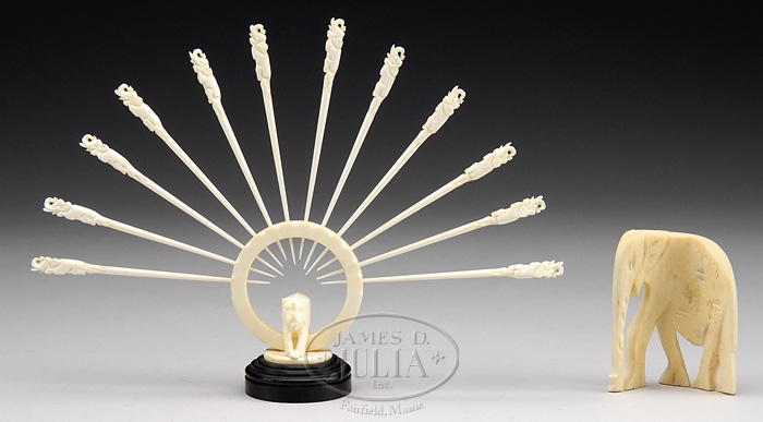 LOT OF CARVED IVORY. 1) Carved ivory tusk depicting a woman’s head with carved basket atop her head. The basket decorated with men harvesting from trees. The top having a hollow center. 2) Elephant decorated ivory skewer set. Each skewer is 4″ l with tapered point and carved elephant finial. Set into an ivory and wood stand with elephant decoration. 3) 2-1/2″ carved elephant. SIZE: Tusk: 14″ x 4-1/2″ dia. CONDITION: Tusk with some discolored age cracking, generally very good. Other pieces very good. 9-95280, 9-95281 (500-1,000)