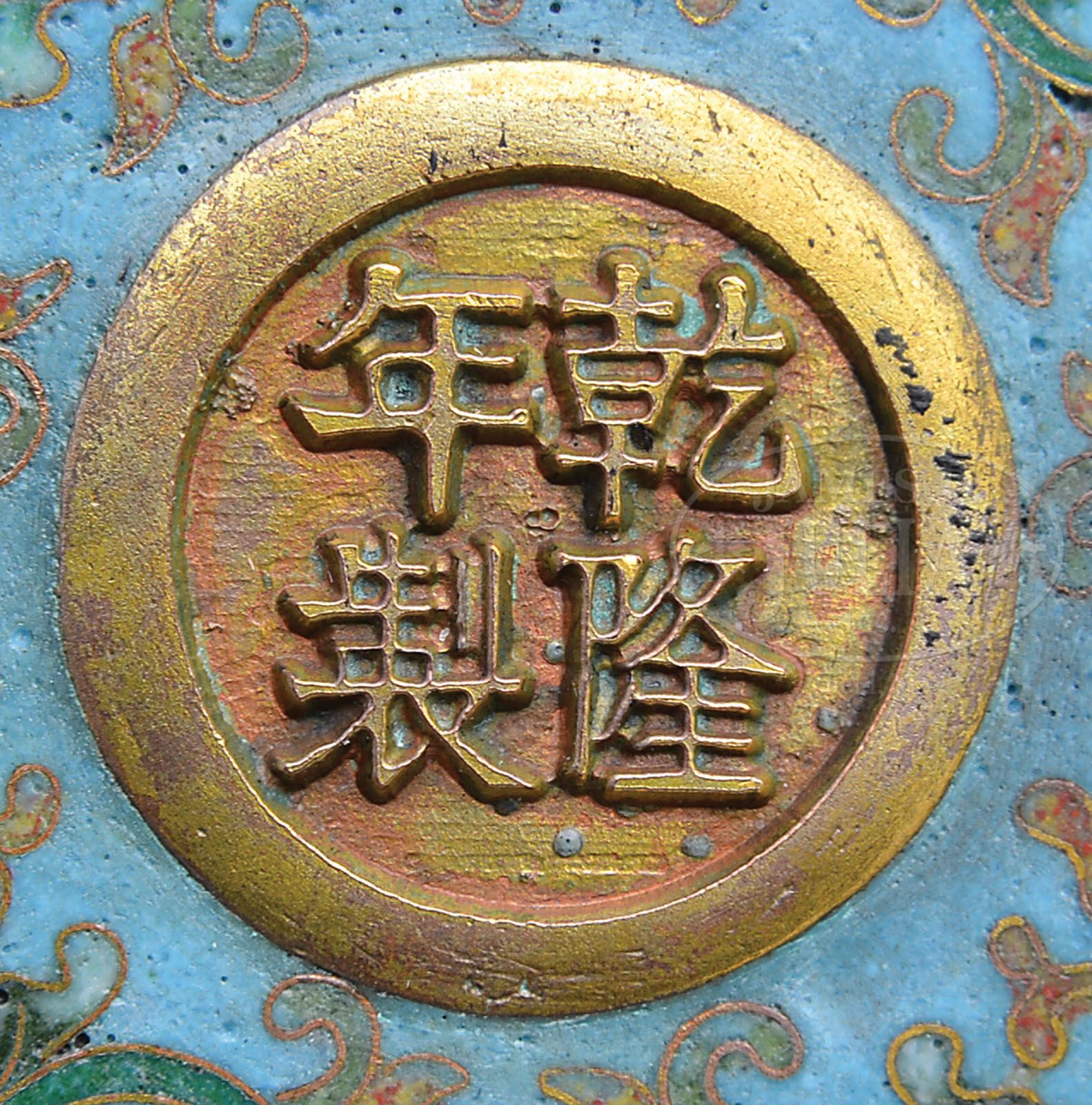 CLOISONNE BASIN. 20th century, China. Relief decoration of branches of peaches on a ground of bats and clouds. All on a turquoise ground. Basin fitted with a conforming insert. Ch’ien Lung mark on base. SIZE: 3-3/4″ h x 8-1/4″ dia. CONDITION: Very good overall. 9-29792 (1,200-1,500)