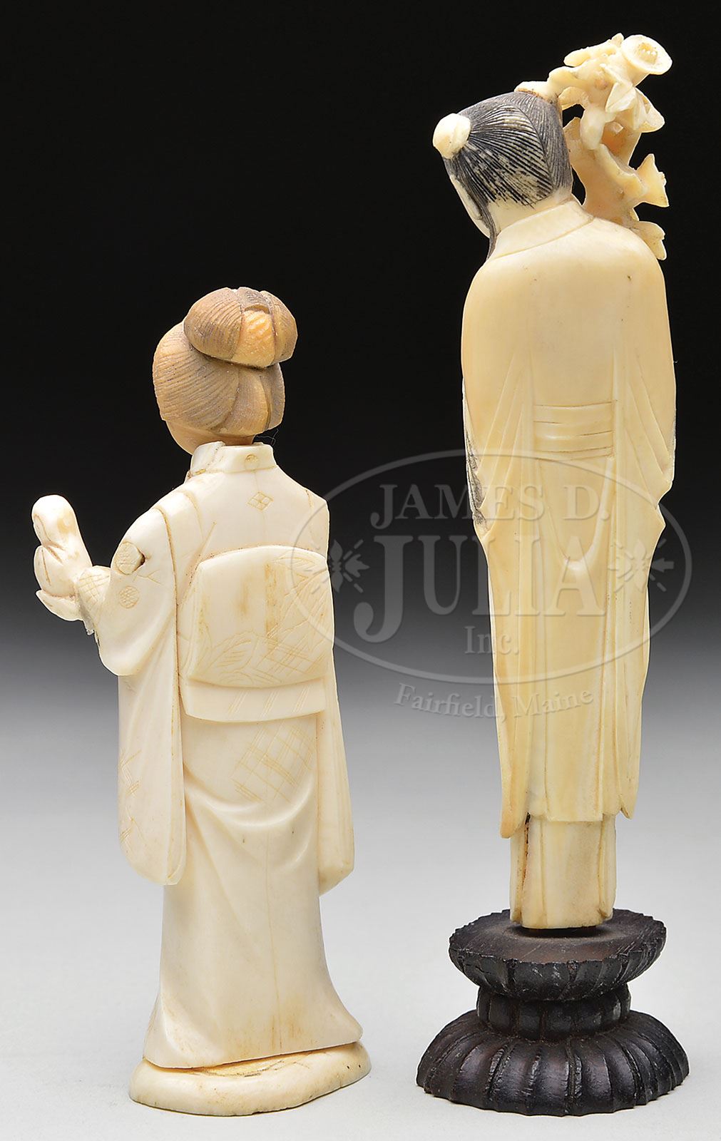TWO IVORY CARVINGS. The first a 19th century Chinese figure of Lan Tsai Ho holding a bunch of flowers mounted on a wood plinth. Together with an early 20th century Japanese carving of a geisha with a stained head. SIZE: 1) 5-1/4″ h. 2) 4-3/4″ h. PROVENANCE: From a fine Augusta, Maine estate. CONDITION: Lan Tsai Ho very good. Geisha with left hand unattached from body and head reattached to body. 9-29278 (300-500)