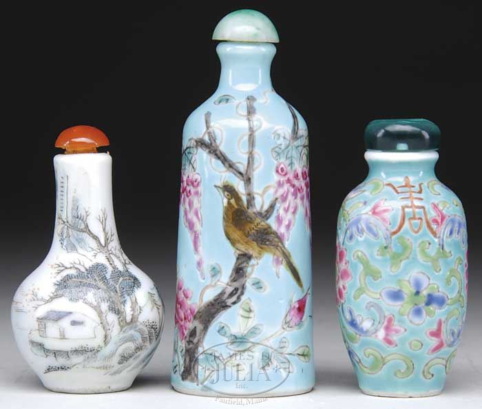 THREE PORCELAIN SNUFF BOTTLES. China. Two with Famille Rose decorations on turquoise ground, third a bottle vase enamel decorated with landscape. SIZE: Tallest: 3-1/4″ h. CONDITION: Generally very good with slight wear to enamels. 7-72612 (200-300)