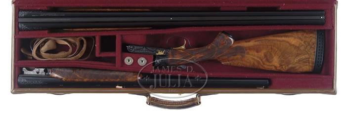 *SPECTACULAR WINCHESTER MODEL 21 GRAND AMERICAN DBL BBL SHOTGUN 2-BBL SET. Cal. 12 ga. SN W32907. Rare & unusual skeet/trap combination set with 26″ & 32″ vent rib bbls with two forearms. The 26″ bbls are choked WS1/WS2 and the 32″ bbls are choked FULL/MOD. Ribs have dbl ivory beads & are marked “CUSTOM BUILT BY WINCHESTER FOR D.W. ELLIS JR.”. It is mounted with extremely, fine-grained, sunburst, center crotch cut, American walnut, Monte Carlo stock with a trap style forearm on the 32″ bbls & a skeet style forearm on the 26″ bbls. All three pieces of the wood are “B” carved with fleur-de-lis and ribbons and the stock is 14-3/4″ over an orig black Winchester waffle pad. It has a flat side receiver with large vignette of a gold setter on the left side, a gold pointer on the right side, two gold pheasant on the floorplate and a gold spaniel head on the trigger bow, all surrounded by full coverage fine foliate arabesque patterns. Grip cap has gold “GRAND AMERICAN” and the outer edge has a gold wire inlay. Engraving extends 3″ over the chamber areas of both sets of bbls. Accompanied by its orig brown leather, burgundy felt-lined, trunk case with compartments for both sets of bbls with forearms, the stocked receiver and a pair of nickeled snap caps. Lid is gold embossed “D.W.E. JR.” Drop at the heel 1-5/8″, Drop at the end of the comb 1-1/4″, drop at front of the comb 1-1/8″. Bore restrictions: 32″ bbls: left – .030, right – .016. 26″ bbls: left – .009, right – .003. Weight with 26″ bbls: 8 lbs. 1.6 oz. CONDITION: Extremely fine plus. Appears new. Retains virtually all of a fine professionally restored finish to both metal & wood, probably factory. Some small spots of pitting on the floorplate. Stock finish has a couple of tiny spots of crazing near the pad and a couple of small dings on the left side. Receiver has an area of finish at the top rear that has turned purple. Mechanics are fine, bright shiny bores. Case is slightly scuffed on the corner reinforcements with a nick or two on the body, otherwise extremely fine. 4-56434 JR567 (30,000-50,000)