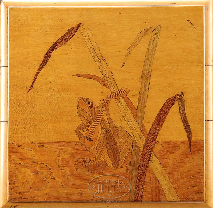 GALLE MARQUETRY STAND. Whimsical Galle stand has marquetry inlay on the top of a frog sitting next to tall slender leaves and playing a stringed instrument. The middle shelf has inlaid frog and leaves with the frog looking upward at a bumblebee. The bottom section of the stand is partitioned for magazines or records. The stand is unsigned but attributed to Galle. We have seen other examples of this frog design that were signed “Galle”. SIZE: Top 13″ sq. Stand 42″ h. CONDITION: Very good, with some minor warping to the top and some worm hole damage to the shelves and partitions. Stand has been refinished. 5-67924 (3,000-5,000)