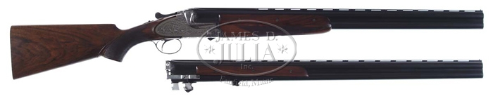 CASED AYA MODEL 37 SUPERPOSED SHOTGUN 2-BBL SET. Cal. 12 ga. SN 421942. Fine Merkel style, superposed shotgun with two sets of bbls, one 28-1/8″ choked FULL/IMP-MOD and the other 26″ choked IMP-CYL/IMP-CYL. Both have flat matted ribs with sgl bead and the numbers “1” and “2” in gold at the chamber ends. Bbls have dbl bites with dbl bbl extensions for Greener crossbolt with ejectors & sgl non-selective trigger. It is mounted with very highly figured streaky French or English walnut with Merkel style 3-pc forearm with a sgl bottom section for both bbls. It has pistol grip stock, 13-3/4″ over a checkered butt. Left side of the bbls has the maker’s name & the right sides are engraved “CYRIL S. ADAMS – HOUSTON, TEXAS.” Bottom of the stock has a gold inlaid “S”. Accompanied by an orig brown leather, green felt-lined, trunk case with maker’s label in the lid. Receiver & detachable lockplates are beautifully engraved in very fine English style rose & scroll patterns with about 80% coverage. Maker’s name is on each side of the receiver. Lock mechanism is gold-plated and inside the lockplates are jeweled. Drop at the heel 1-1/2″, drop at the comb 1-3/8″. Bore restrictions: 28″ bbls top – .030, bottom – .029. 26″ bbls top – .010, bottom – .008. Weight with 26″ bbls: 7 lbs. 0.1 oz. .Also accompanied by a letter from Cyril S. Adams stating that he did import a few of these guns for his customers. CONDITION: Very fine. Bbls all retain about 98% strong orig blue with only minor edge wear. Receiver & lockplates have been polished bright which appears to be orig factory work although the insides are case colored. A catalogue, which accompanies this lot, shows an identical gun with polished receiver & lockplates. Bottom of the forearm has two small grain checks, otherwise the wood is sound with minor nicks & scratches and retains most of its orig oil finish. Mechanics are fine, brilliant shiny bores. Case is equally fine. 4-56397 JR577 (8,000-12,000)