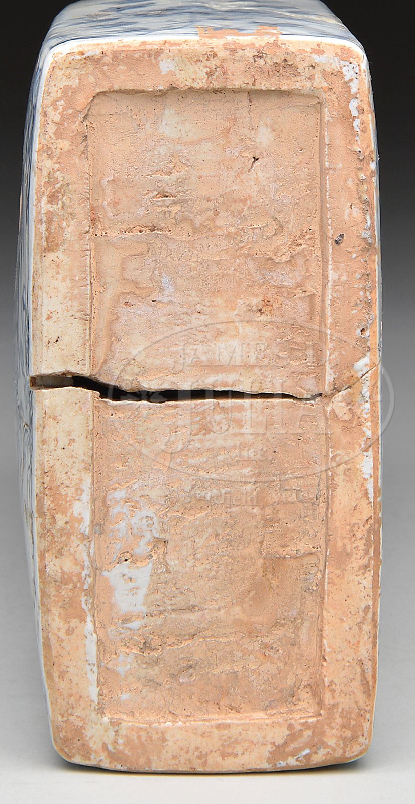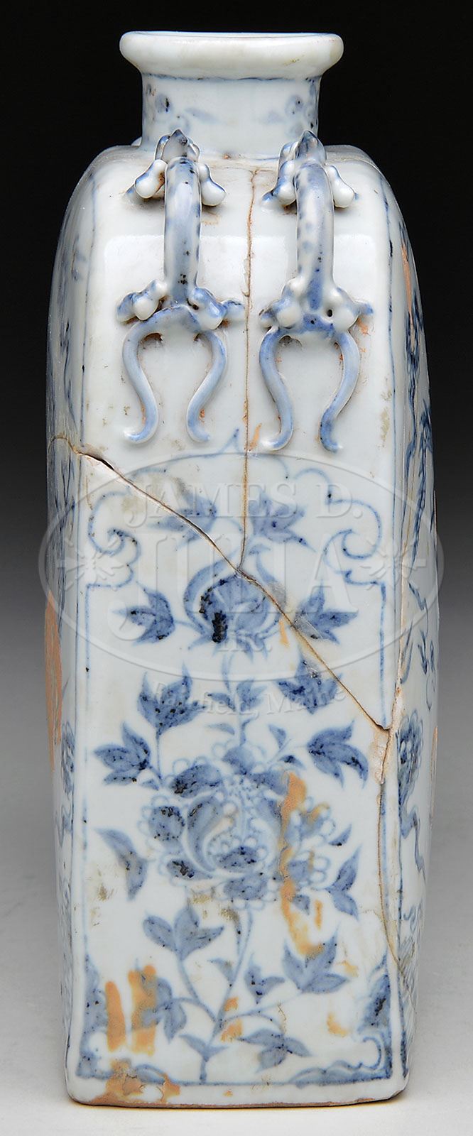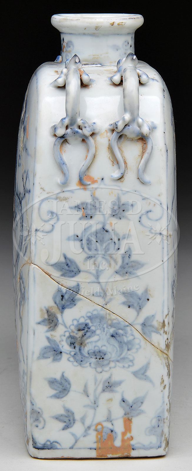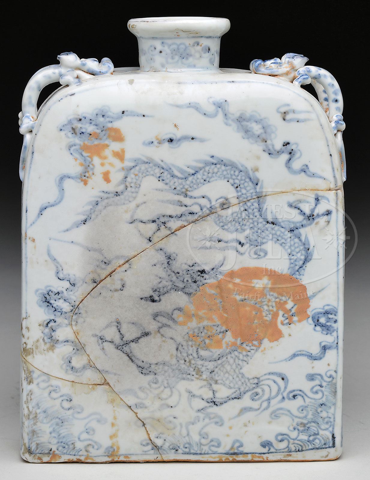 PORCELAIN FLASK. 20th century, China. Flattened rectangular form with slightly rounded shoulder and four molded dragon legs. Underglaze blue decoration of dragons and clouds. SIZE: 9-1/2″ h x 6-1/2″ w. CONDITION: Fair with extensive repairs. 9-28717 (600-800)