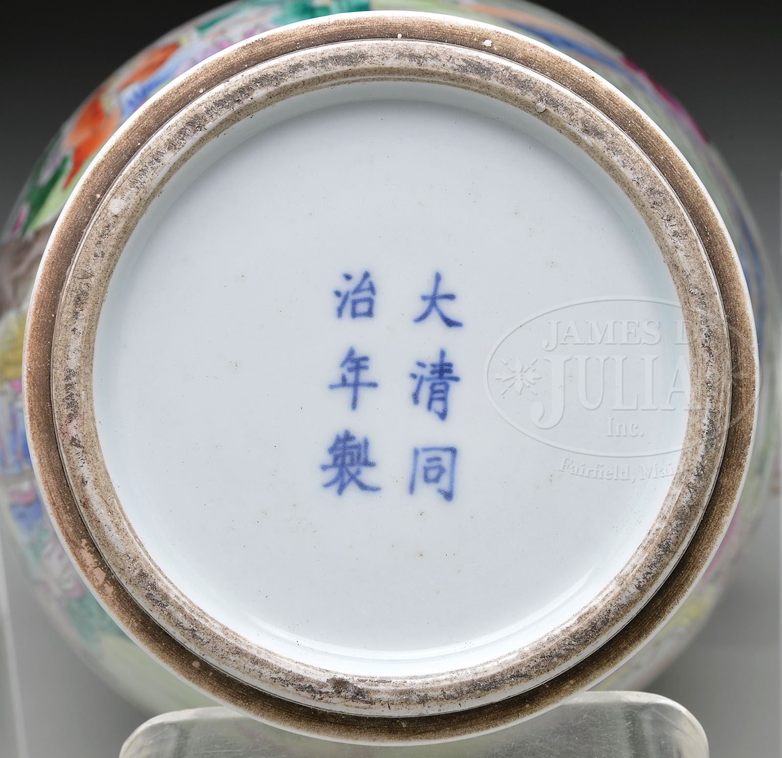PORCELAIN JAR. 20th century, China. With lion mask jump rings. Famille Rose decoration of Buddhist saints in a landscape. Cover with dog finial. Tsung Chih mark on the base in underglaze blue. SIZE: 14-3/4″ h. CONDITION: Generally very good. 9-28724 (600-800)