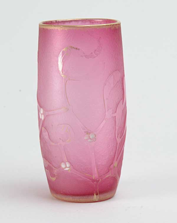 DAUM NANCY VASE. Cranberry glass with cameo decoration of leaves and berries with white and enameling highlights. Signed “DAUM NANCY” in gold lettering on base. SIZE: 5″ tall. CONDITION: Very good to excellent. 5-68339 (500-700)