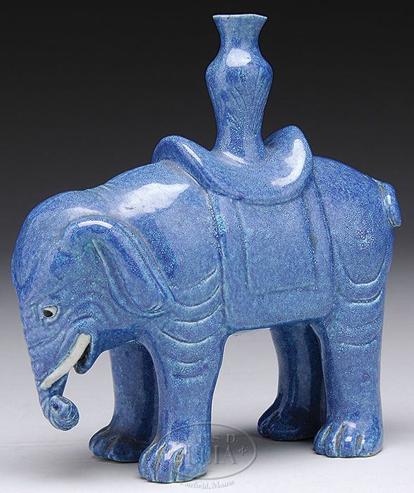 PORCELAIN VASE. 19th century, China. Cast in the form of an elephant caparisoned with a vase on its back. Robin’s egg blue color glaze. SIZE: 8″ h. CONDITION: Very good. 7-73117 (300-500)