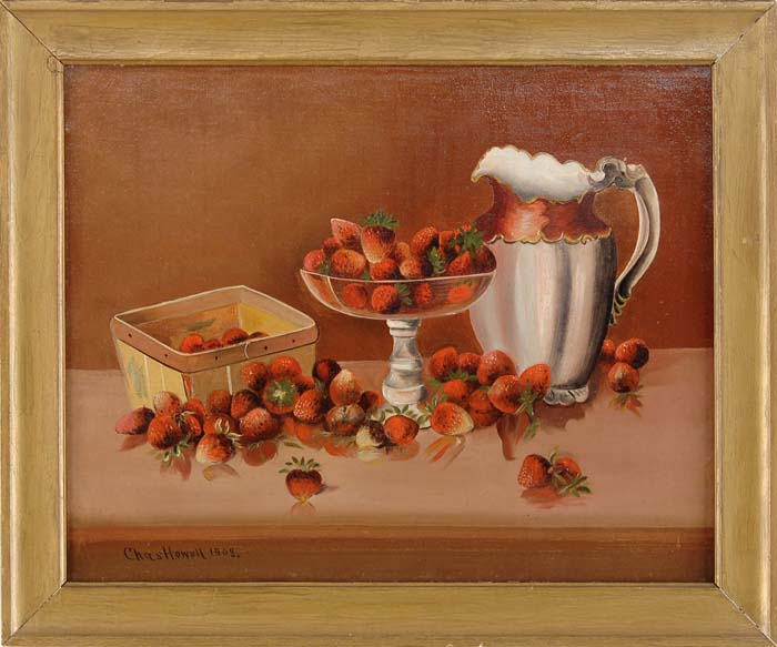 CHARLES HOWELL (American, Early 20th Century) STRAWBERRIES AND MILK. Oil on canvas tabletop scene shows a red and white milk pitcher next to a glass compote filled with strawberries and a square basket with partial contents of strawberries. A number of strawberries are on the table top. Signed lower left “Chas. Howell 1908”. Housed in it’s original; gold molded wood frame. SIZE: 16” x 20”. CONDITION: Good. 9-71546 (700-900)