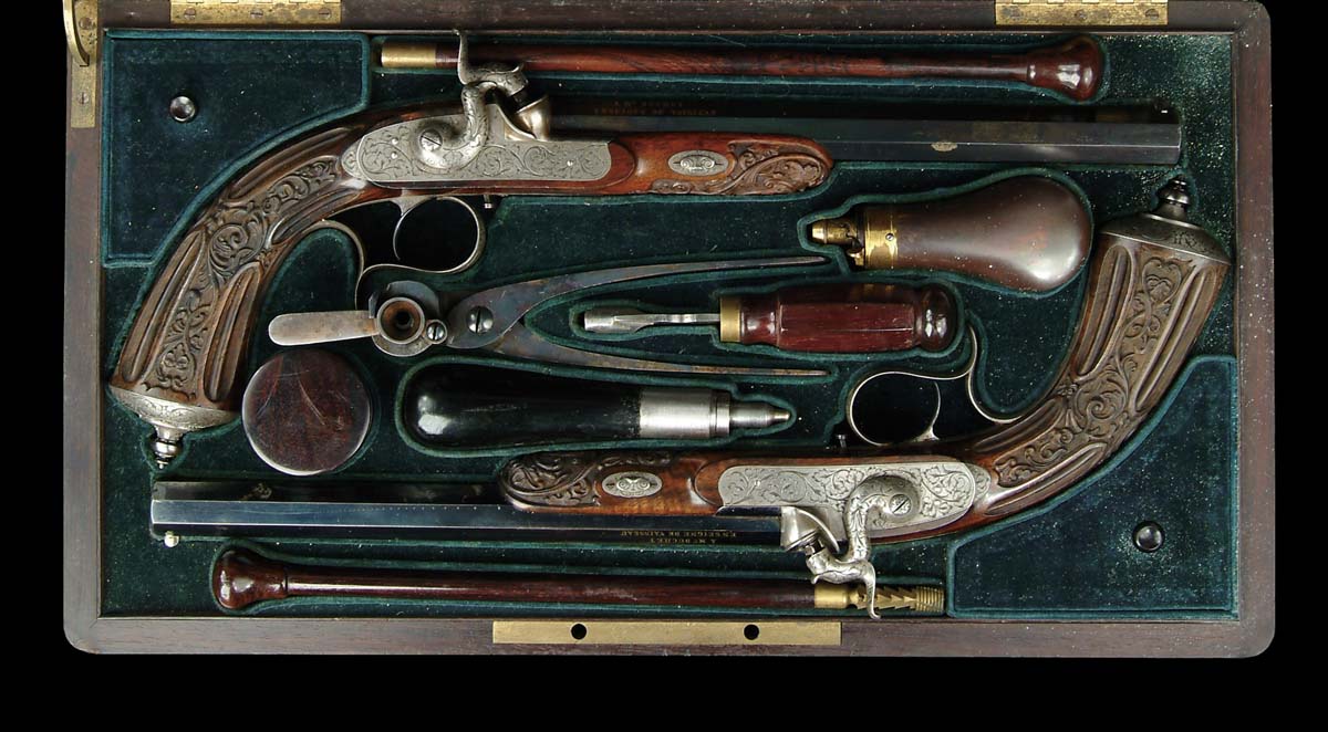 CASED PAIR OF FRENCH TARGET PISTOLS. NSN. Cal. 50. 10-1/2” oct bbl. Both are marked identically with an “N” over a crown and “DONNE PAR L’EMPEREUR” on top of the bbl; “ECOLE NORMALE DE TIR 1859 / 1ER PRIX D’INSTRUCTION” on the left side of the bbl; “A Mr DOUCET / ENSEIGNE DE VAISSEAU” on the right side of the bbl. This pair of pistols was made by “BAILLOT & HEBERARD” whose name is stamped in gold inside the lid. The inscription has the crest of Napoleon III, emperor of France, in the mid-19th century. The inscription reads, roughly, “Given by the emperor to Mr. Duchet, enseign of the ship. First place in the class of the Normale School of Shooting 1859” (the Normale Shooting School was a military school associated with the navy). They are cased in a fine mahogany case lined with green velvet with compartments in the French style. Containing a loading rod, powder flask, combination screwdriver/nipple wrench, cap box, cleaning rod, and mini-style bullet mold with hollow base plunger. CONDITION: Excellent. Overall with light spotting at the muzzle of both bbls but retaining most of the blue. Accessories are fine except the bullet mold plug, which has a replaced handle painted black. Velvet is slightly dirty; there is no key. Case is fine with minor scratches on the top. Lifting plate on the front is missing but easily replaced. Mechanically fine. 4-54344 FS111 (25,000-40,000)