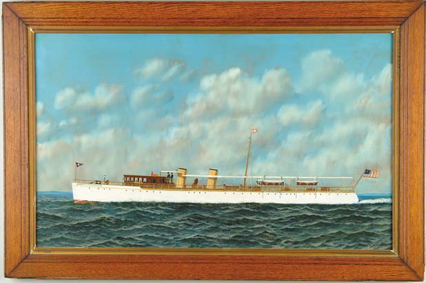 ANTONIO NICOLO GASPARO JACOBSEN (American, 1850-1921) SHIP PORTRAIT OF THE WINCHESTER II WITH WINCHESTER BOWL. Fine oil on board portrait of the motor yacht Winchester. Boat travels right to left flying American flag off stern, red and white pennant “R” off central mast and blue with red cross and white star flag at bow (New York Yacht Club). Two men at wheel, white hulled boat with three lifeboats and open deck with long white awning. Two stacks at midship. Seagulls are seen off stern. Signed bottom right “Antontio Jacobsen 1910”. There were four yachts named “Winchester” made between 1907 and 1915. Named after Peter Winchester Rouss and the name of the Virginia city from which he came. Housed in an oak molded wood frame with gold liner. Accompanying the painting is a blue rimmed soup bowl with “Winchester” emblazoned on the ivory edge. The bowl is made by John Maddox & Sons of England. SIZE: CONDITION: 22” x 35-3/4”. CONDITION: Some inpainting, mostly in sky. Very good. 9-96699 (12,000-16,000)