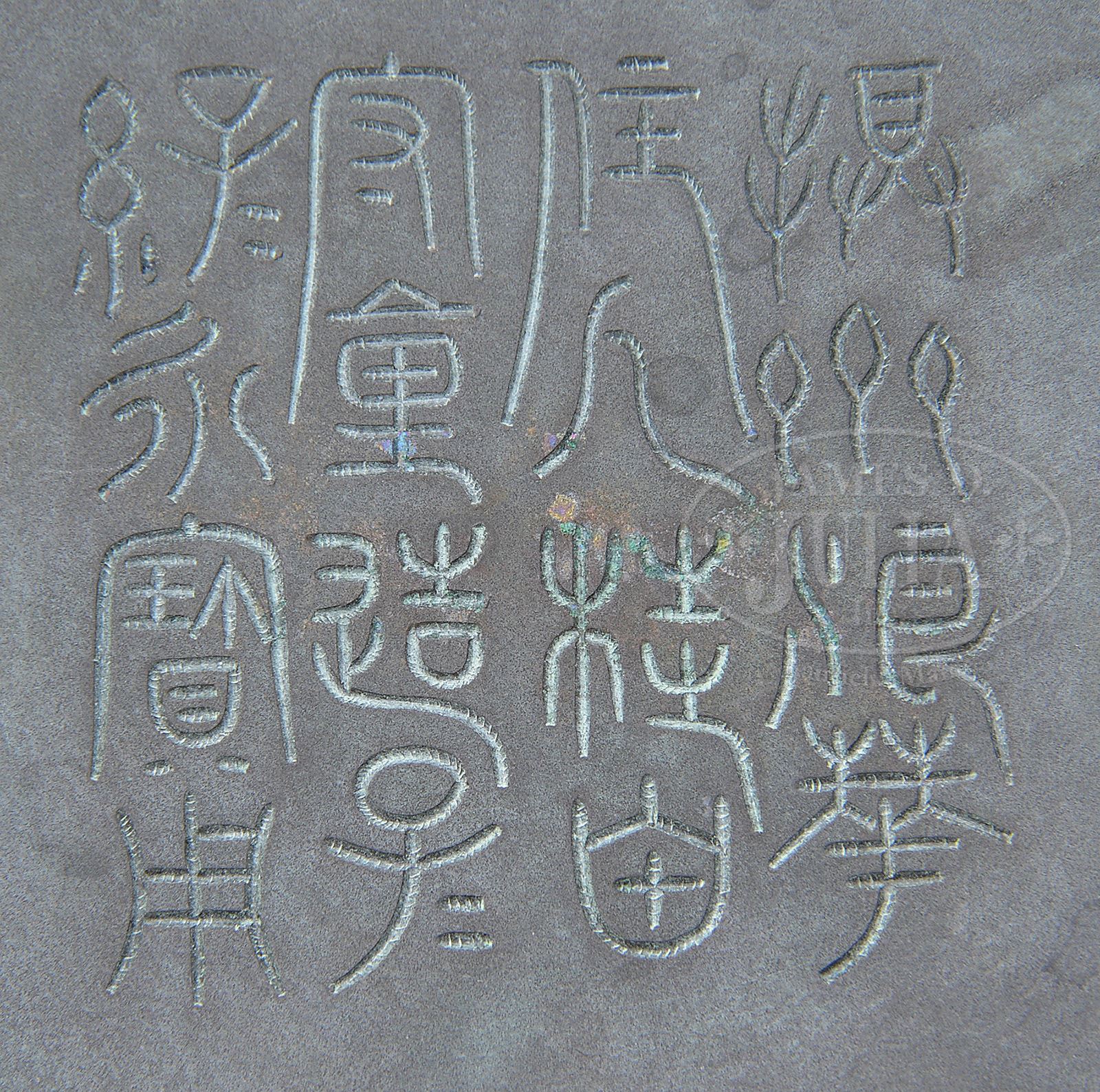 BRONZE VASE. 18th century, China. Finely cast in the form of an archaic Lei ritual vessel. Six buffalo headed jump rings at the side. Tao tieh masks, dragons and bird scrolls on a thunder meander ground. Archaic inscription on the base. SIZE: 12″ h x 14″ dia. CONDITION: Very good with untouched original surfaces. 7-73748 (300-500)