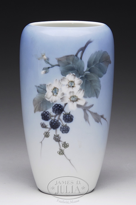ROYAL COPENHAGEN ART POTTERY VASE. Blue and white ground vase having a branch with blackberries and white blossoms. Marked on bottom “288 1049” with possible artist signature “T H”. SIZE: 9″ h. PROVENANCE: Collection of Elwyn Dearborn, Medford, NJ & Portland, ME. CONDITION: Very good. 9-96132 (150-250)