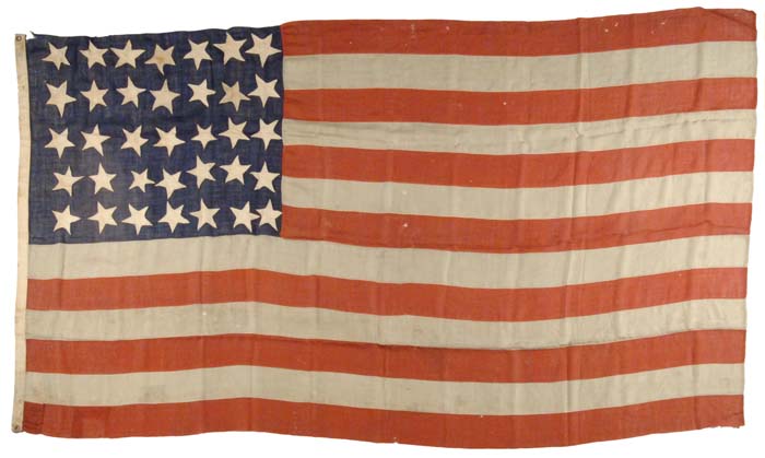 LARGE (5′ 8″ BY 11′) COMMERCIALLY MANUFACTURED 35 STAR U.S. NATIONAL FLAG. A large (68″ on the hoist by 132″ on the fly) machine sewn, 35 star (1863-1865) U.S. national flag. While not approximating either of the closest size standard military size flags (10′ by 20′ U.S. Army “Storm” Flag or 6.33′ by 12′ U.S. Navy Ensign “No. 9″), this commercially produced 35 star U.S. national flag may have seen military service as a result of a private or state purchase. In conformity with the 1818 Flag Act, the field of this flag is composed of 13 alternating horizontal red and white wool bunting stripes, commencing and ending with red, varying in width between 5″ and 6″ but most 5-1/2″ wide +/- 1/4″, joined by flat felled seams sewn with white sewing thread on a treadle machine. Inset into the upper, hoist corner, also machine sewn with white thread is a dark blue, wool bunting canton formed by joining horizontally two 18″ widths of bunting to form a canton 35-1/2″ on the hoist by 45″ to 46″ on the fly. 35 white cotton muslin, 5-pointed stars, each measuring between 5-1/4″ to 6″ across their points are hand appliquéd to the canton in five horizontal rows of seven stars each. 34 of these stars are sewn to the obverse side of the canton, and the blue wool bunting on the reverse side of the canton has been cut away and hemmed under to show stars that are 4-1/4″ to 4-1/2″ across their points. In an anomaly of production, however, the fifth star from the hoist in the third horizontal row of stars is appliquéd to the reverse side and the blue wool bunting opposite it on the obverse side has been cut away and hemmed under to expose the white star. The hoist edge is finished by the attachment of a 2″ wide white cotton, twill weave, canvas heading having a 2-pc brass grommet (15/16″ outer diameter and 7/16” inner diameter) worked into each end of the heading. On the reverse side of the heading in blue stenciled figures and letters within an oval border is the enigmatic inscription, “37-1/2 yds”, possibly the length of the roll of canvas from which the heading was made. On the obverse side of the heading appears to be the flag’s owner’s name, in ink: “Dickey” at the lower edge and “H H DICKEY” near the top edge. Further research may yield a connection of this name with a military figure from the Civil War. CONDITION: This flag is in very good condition. A few tears and holes in the lower two stripes, close to the heading have been patched, but both the damage and the repairs are thought to be contemporaneous to the flag’s Civil War service. 4-60215 HMM (2,000-3,000)