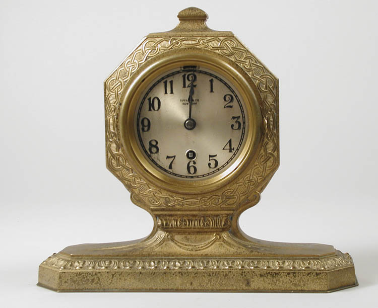 SIGNED TIFFANY STUDIOS MANTLE CLOCK. Clock in gold dore. Face signed by the retailer, “TIFFANY & CO. NEW YORK”. Bronze signed by the maker underneath, “TIFFANY STUDIOS NEW YORK 1870”. Clock mechanism signed “CHELSEA CLOCK CO. BOSTON, U.S.A.” SIZE: 10 3/4″ long by 9 1/4″ tall. CONDITION: Missing glass face on door, otherwise very good condition. 5-67918 (2,250-2,750)