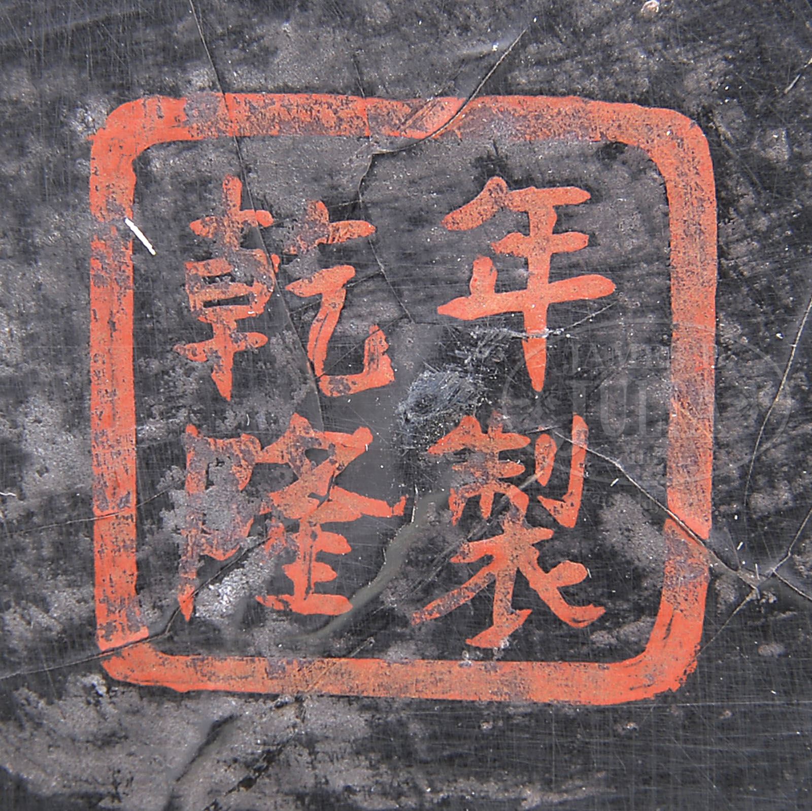 LACQUERED BRUSH POT. 20th century, China. Cylindrical form. Wood with lacquered surface in black and red with gilt. Ch’ien Lung mark on the base. SIZE: 7-1/2″ dia x 8″ h. CONDITION: Very good. 9-28721 (400-600)