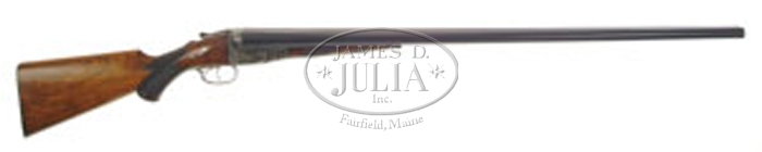 RARE PARKER DH GRADE LARGE FRAME DBL BBL SHOTGUN. Cal. 8 bore. SN 163553. Built on a #6 frame with 36″ Titanic steel bbls with matted rib, sgl bead, doll’s head extension, extractors & dbl triggers. Receiver is engraved in typical “D” patterns with a bird dog on each side & four flying ducks on the floorplate surrounded with about 50% coverage, fine foliate arabesque & border patterns. Wood is very nicely figured English walnut with checkered splinter forearm & pistol grip stock with teardrop side panels, 14-1/2″ over a skeleton buttplate with checkered center. Accompanied by a Parker letter fully identifying this shotgun & indicating that it was shipped July 12, 1913 to Charles Parker Co.’s office in New York City. It originally weighed 12 lbs. 4 oz. Drop at the heel 2-1/2″, drop at the comb 1-3/8″. Weight: 12 lbs. 1.8 oz. CONDITION: Very fine plus. Bbls retain most of a professionally restored finish with minor muzzle edge wear and some browning by the top rib. Receiver retains traces of case colors being mostly a silver brownish patina. Wood is sound with minor nicks & scratches and retains most of the orig varnish on the buttstock & about all of a restored finish on the forearm. Mechanics are crisp, bright shiny bores. 5-60480 JR150 (5,000-10,000)