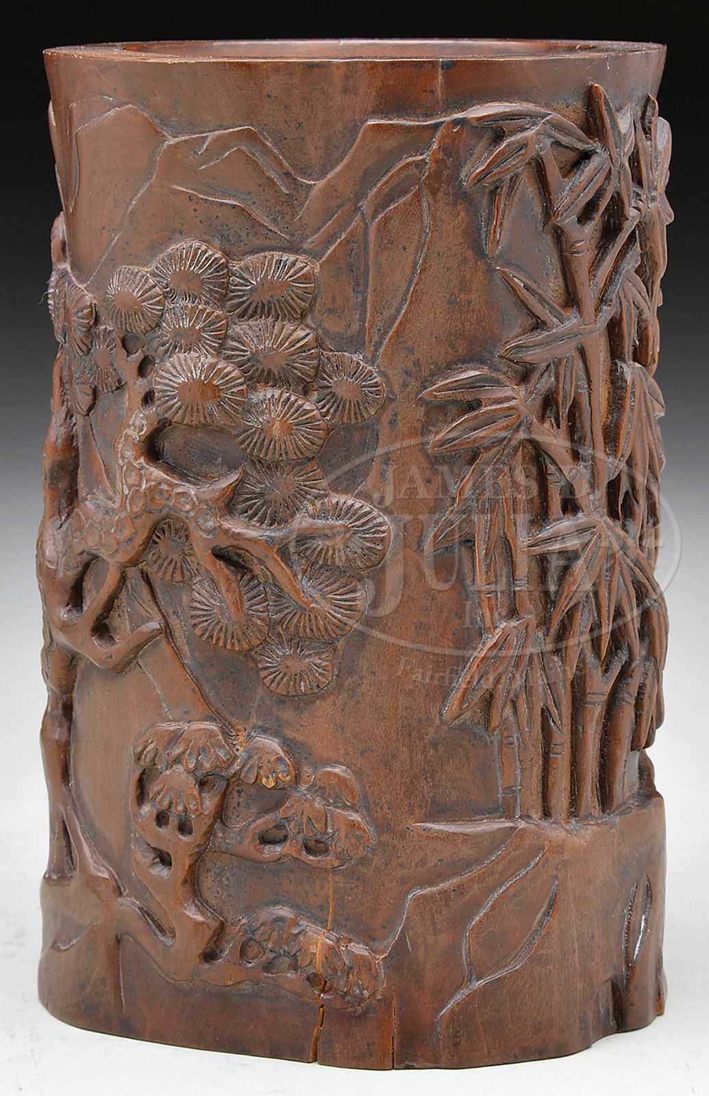 BOXWOOD BRUSH HOLDER. Early 20th century, China. Brush holder carved with an immortal and attendant in a landscape. SIZE: 3-1/2″ dia x 5-3/4″ h. CONDITION: Very good. 7-73680 (200-300)