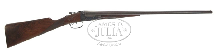 *PARKER DHE GRADE DAMASCUS DBL BBL SHOTGUN. Cal. 20 ga. SN 148887. Built on an “O” frame with 26″ Damascus steel bbls choked FULL/CYL with matted rib, dbl ivory beads, and doll’s head extension, ejectors & dbl triggers. Receiver is engraved with typical “D” patterns consisting of vignettes of a bird dog on each side & four flying ducks on the floorplate, surrounded by about 50% arabesque & border patterns. Wood is center crotch cut feather grain American walnut with checkered splinter forearm & straight stock with raised teardrop side panels, 14-3/8″ over a checkered butt. Stock may be an old replacement. Drop at the heel 2-3/4″, drop at the comb 1-1/4″. Weight: 6 lbs. 3.7 oz. CONDITION: Fine to very fine. Bbls retain 95-97% strong orig Damascus pattern with some slight thinning over the forearm. Receiver, trigger guard & wood have retained most all of a fine professionally restored finish. Case colors by Turnbull. Serial number has been re-engraved. Mechanics are fine, bright shiny bores. 5-60485 JR152 (3,000-5,000)