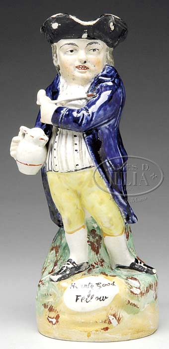 STAFFORDSHIRE PRATT TYPE “HEARTY GOOD FELLOW” TOBY JUG. 19th century. Depicting a gentleman in blue coat standing with pipe and pitcher, the handle a stylized tree trunk. Inscribed on base. SIZE: 11-1/2″ h. PROVENANCE: From a fine Texas Estate. CONDITION: With general overall abrasion, especially around spout, and repairs to rear of base rim. 9-22965 (500-700)