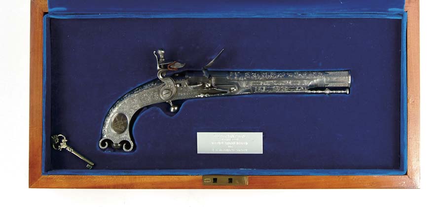 COMMEMORATIVE PITCAIRN FLINTLOCK PISTOL. SN 264. Cal. 52. 7” multistage bbl. The plaque on the left side of the grip is marked “Lexington / April / 19 1775.” Major Pitcairn used a pistol similar to this to fire the first shot of the American Revolution. This replica is in a case with a gold tooled leather top, reading “THE / PIRCAIRN PISTOL”. An aluminum plate inside the blue lined case states that it was authorized by the Whitney Armory museum. CONDITION: Externally new with a patch of rust inside the bbl. Key works the lock. From the collection of the late Bruce McDowell. 4-54824 FS96 (500-1,000)