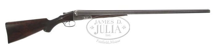 *PARKER PH GRADE DBL BBL DAMASCUS SHOTGUN. Cal. 12 ga. SN 115455. Built on a #2 frame with 29-7/8″ Damascus twist bbls choked FULL/FULL with matted concave tapered rib, sgl bead, extractors & dbl triggers. Lightly engraved receiver & trigger guard. Wood is nicely figured American walnut with checkered splinter forearm & pistol grip stock, 14-1/4″ over a dog’s head buttplate. Accompanied by a Parker letter indicating shipment on February 17, 1903. Letter indicates it was a hammer gun when it obviously is hammerless. Weight: 7 lbs. 11.2 oz. CONDITION: Very good. Bbls retain most of their orig blue/brown twist pattern. Receiver retains 25-30% case colors with the balance turned silver. Wood is sound with usual nicks, dings & scratches and retains 75-80% of an old restored finish. Good mechanics, bright shiny bores. 5-60338 JR62 (1,000-2,000)