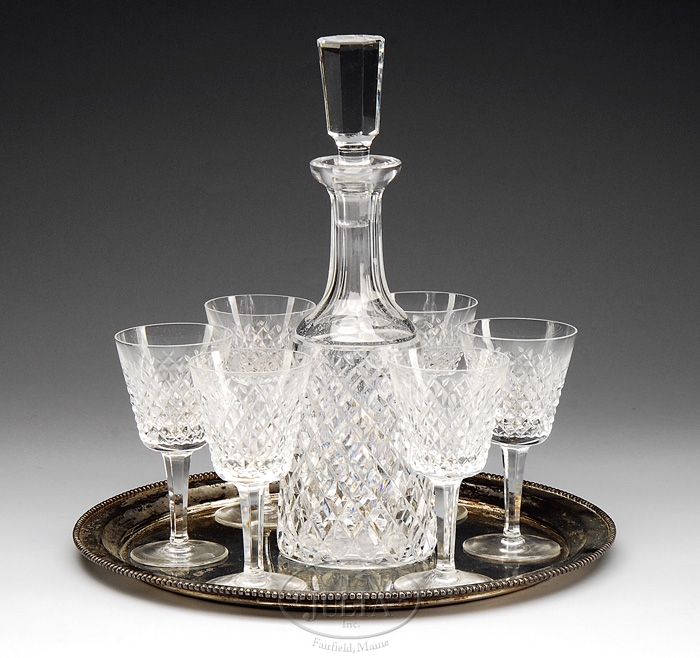 14 PIECES OF WATERFORD CRYSTAL. Lot includes: Six 5-3/4″ h wine glasses and a 13-1/4″ decanter with stopper accompanied by a round silver plated tray. 5-1/2″ h rose bowl; 4″ creamer; 4-1/2″ mustard; 2″ h x 4″ dia. open sugar; 3-3/4″ salt & pepper; Two-piece 5″ h dinner bell and stand. All in the diamond pattern in clear class. Decanter appears to be unmarked, all else is marked. PROVENANCE: Collection of Elwyn Dearborn, Medford, NJ & Portland, ME. CONDITION: Very good, one glass rim with small chip. 9-96035, 9-96056; 9-96195 (400-800)