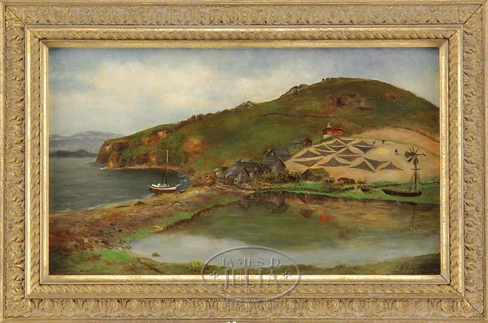 D KINGSLAID (American, 20th Century) “HUNTER’S POINT”. Oil on masonite west coast scene depicts a coastal tannery with several connected buildings on hillside. Three men are seen on hillside with triangular hides. A sailboat has been pulled ashore and the coastline has cliffs and mountains. Signed bottom right “D Kingslaid 1880″ and titled lower left. Housed in a gilt gesso decorated frame. SIZE: 11″ x 18-1/2”. PROVENANCE: From the Estate of Geraldine Gaba, Scottsdale, AZ. CONDITION: Very good with a couple of small nicks. 9-94812 (500-1,000)