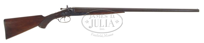 PARKER PH GRADE DAMASCUS DBL BBL HAMMER SHOTGUN. Cal. 20 ga. SN 161467. Built on an “O” frame with lightning cuts in the water table. It has 28″ twist bbls, choked FULL/IMP-MOD with matted tapered rib, sgl bead, doll’s head extension & extractors. Receiver & lockplates have light border decoration with the maker’s name on each lockplate. It has serpentine shaped opening lever. Wood is nicely figured American walnut with checkered splinter forearm and semi-pistol grip stock, 13-1/2″ over a dog’s head buttplate. There is a small silver shield initial plate on top of the wrist. CONDITION: Very fine, as completely restored by Turnbull. Retains virtually all of this fine custom finish to both metal & wood. Mechanics are fine, brilliant shiny bores. 5-60473 JR195 (750-1,250)