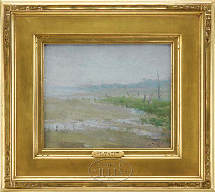 JULIAN JOSEPH (American, 1882-1964) LOW TIDE. Oil on canvasboard coastal scene shows a sandy and marsh area with receding tide leaving small tidal pools. All under a light blue and lavender sky. Signed lower right “J. Joseph”. Housed in a fine carved and gilt modern wood frame having gilt artist plaque. SIZE: 8-1/2″ x 10-1/2″. CONDITION: Very good. 9-95040 (1,200-1,600)