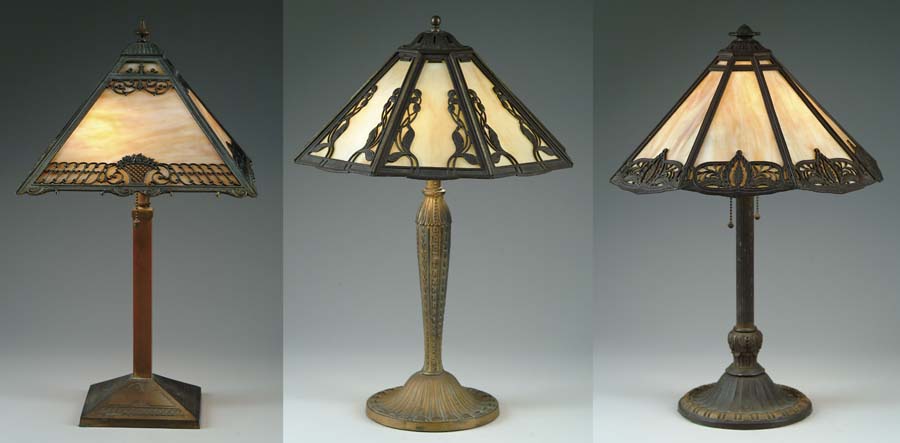 THREE PANEL LAMPS. Lot of three carmel slag panel lamps have decorative cast metal filigree shade frames supporting flat carmel slag panels. Each shade is married to an appropriate style base. Two of the bases are signed “E. M. & Co.” the other is unsigned. SIZE: Shades are 12 in., 14 in. and 15 in. dia. Overall heights are approx. 21 in. CONDITION: Some wear to finish on metal, otherwise very good. Estate of Edwin Schiebel Sr. 5-60032, 5-60033, 5-60034 (500-700)